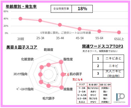 女性の18%【サンプルデータ数980人】で発生している「ニキビあと」悩みを65項目で徹底的に分析。2ページに凝縮しました(SAMPLE例は画像4-5)