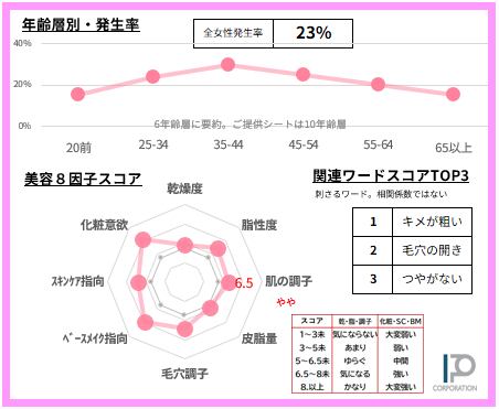 女性の23%【サンプルデータ数1,180人】で発生している「キメが粗い」悩みを65項目で徹底的に分析。2ページに凝縮しました(SAMPLE例は画像4-5)