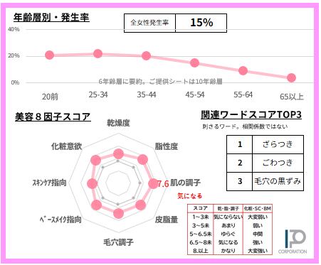 女性の15%【サンプルデータ数790人】で発生している「ざらつき」悩みを65項目で徹底的に分析。2ページに凝縮しました(SAMPLE例は画像4-5)