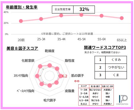 女性の32%【サンプルデータ数1,610人】で発生している「くすみ」悩みを65項目で徹底的に分析。2ページに凝縮しました(SAMPLE例は画像4-5)