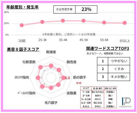 女性の23%【サンプルデータ数1,170人】で発生している「つやがない」悩みを65項目で徹底的に分析。2ページに凝縮しました(SAMPLE例は画像4-5)