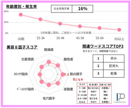 女性の16%【サンプルデータ数860人】で発生している「赤み」悩みを65項目で徹底的に分析。2ページに凝縮しました(SAMPLE例は画像4-5)
