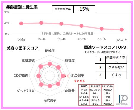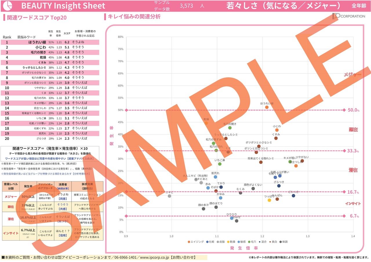 女性の15%【サンプルデータ数780人】で発生している「顔色がよくない」悩みを65項目で徹底的に分析。2ページに凝縮しました(SAMPLE例は画像4-5)