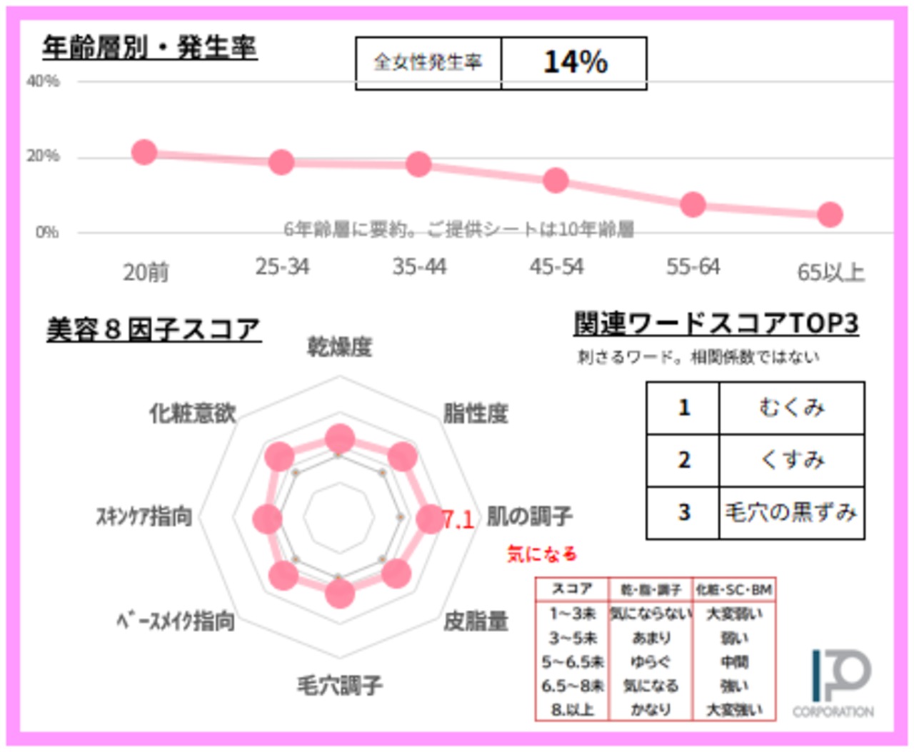 ・美容8因子スコアは各10ポイント化で見える化。チャートの外側に大きいほど調子の悪化(QOL低下)または指向の強さを示します