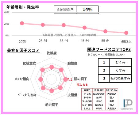 女性の14%【サンプルデータ数720人】で発生している「顔のむくみ」悩みを65項目で徹底的に分析。2ページに凝縮しました(SAMPLE例は画像4-5)