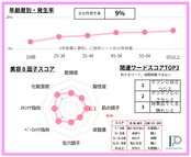 ・美容8因子スコアは各10ポイント化で見える化。チャートの外側に大きいほど調子の悪化(QOL低下)または指向の強さを示します
