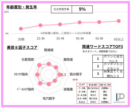 女性の9%【サンプルデータ数470人】で発生している「腕や身体の目立つところのシミ」悩みを65項目で徹底的に分析。2ページに凝縮しました(SAMPLE例は画像4-5)