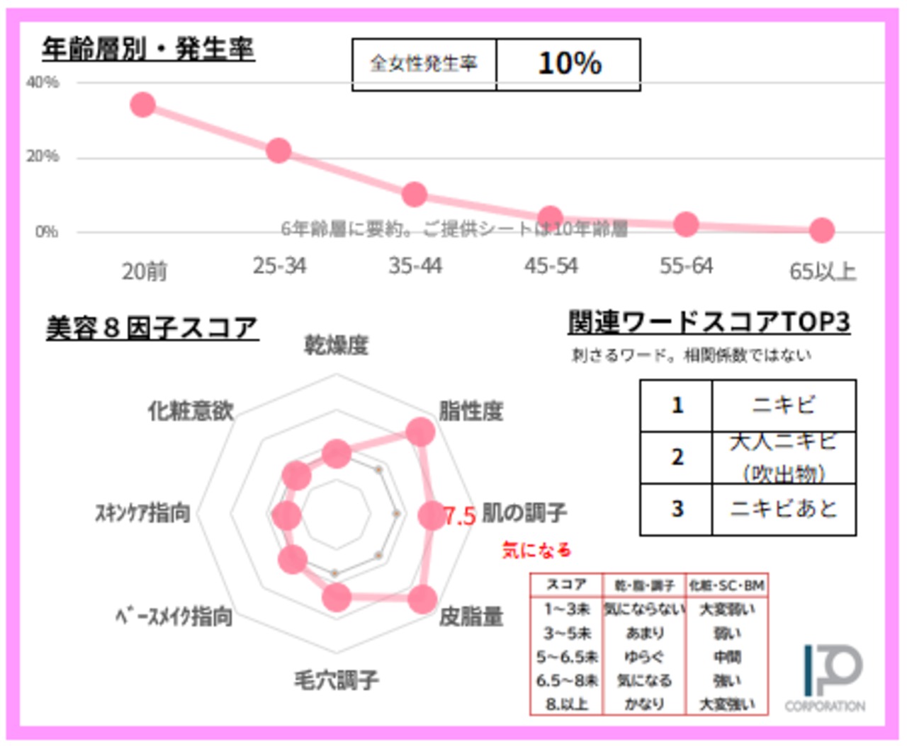 女性の10%【サンプルデータ数540人】で発生している「ニキビ肌」感覚を68項目で徹底的に分析。2ページに凝縮しました(SAMPLE例は画像4-5)