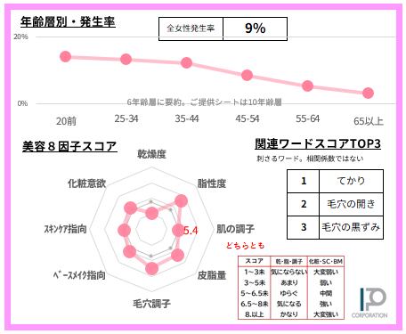 女性の9%【サンプルデータ数490人】で発生している「オイリーな混合肌」感覚を68項目で徹底的に分析。2ページに凝縮しました(SAMPLE例は画像4-5)