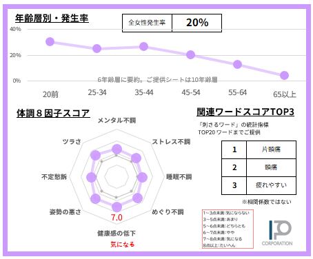 女性の20%【サンプルデータ数1,030人】で発生している「片頭痛」悩みを68項目で徹底的に分析。2ページに凝縮しました(SAMPLE例は画像4-5)