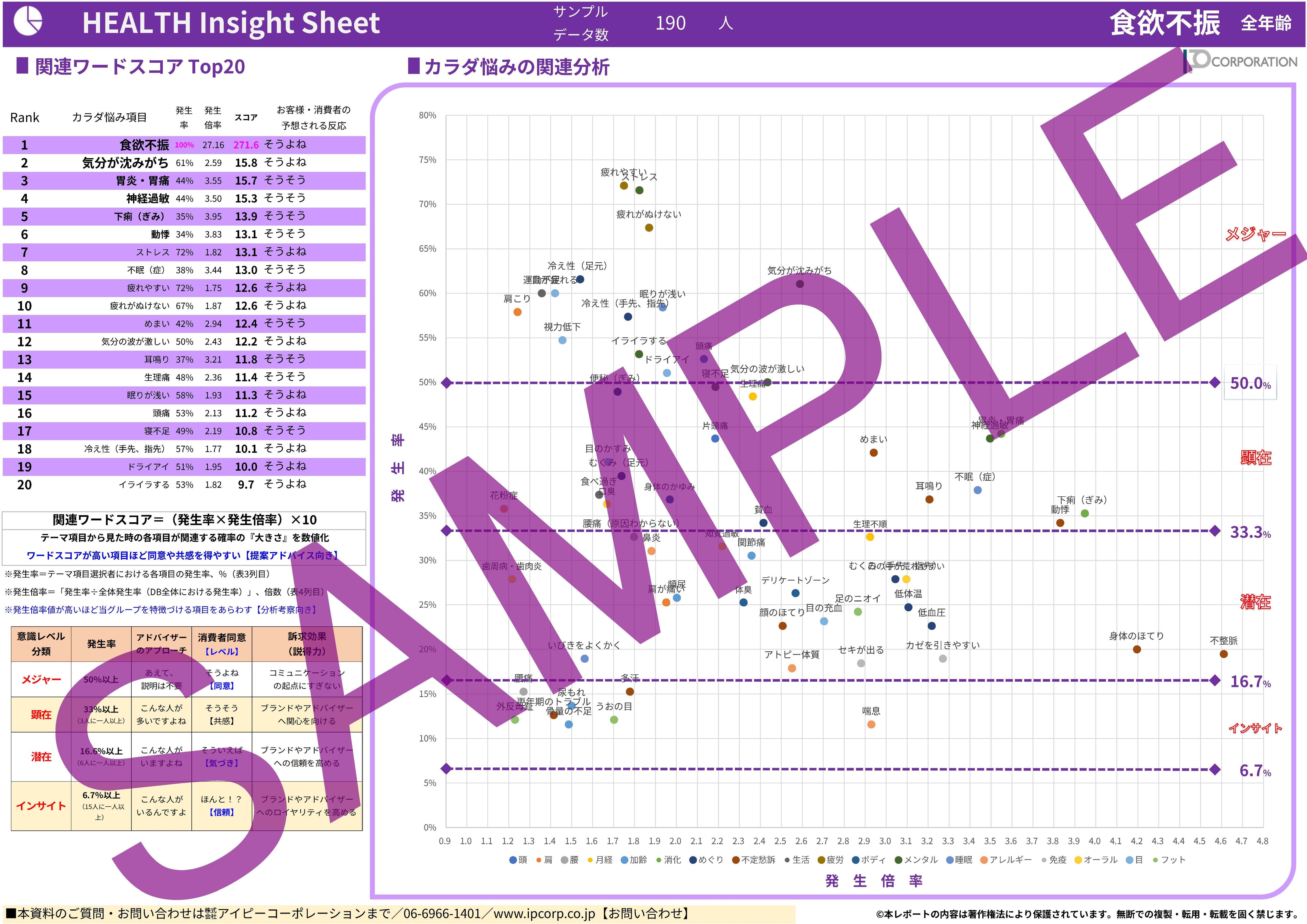 女性の14%【サンプルデータ数670人】で発生している「四十肩、五十肩などの肩が痛い」悩みを68項目で徹底的に分析。2ページに凝縮しました(SAMPLE例は画像4-5)