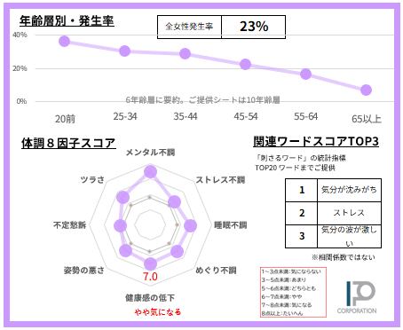 女性の23%【サンプルデータ数1,220人】で発生している「気分が沈みがち」悩みを68項目で徹底的に分析。2ページに凝縮しました(SAMPLE例は画像4-5)