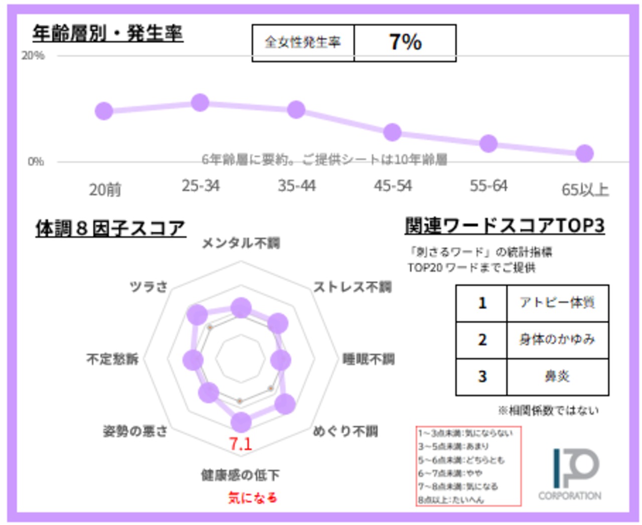 女性の7%【サンプルデータ数360人】で発生している「アトピー体質」悩みを68項目で徹底的に分析。2ページに凝縮しました(SAMPLE例は画像4-5)