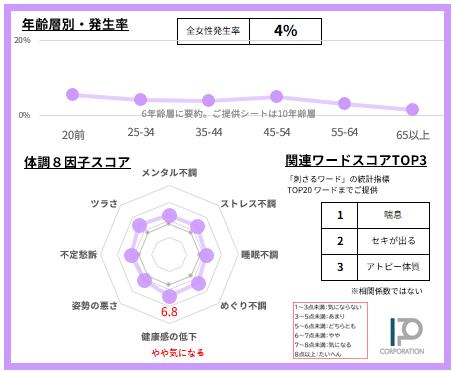 女性の4%【サンプルデータ数200人】で発生している「ぜんそく」悩みを68項目で徹底的に分析。2ページに凝縮しました(SAMPLE例は画像4-5)