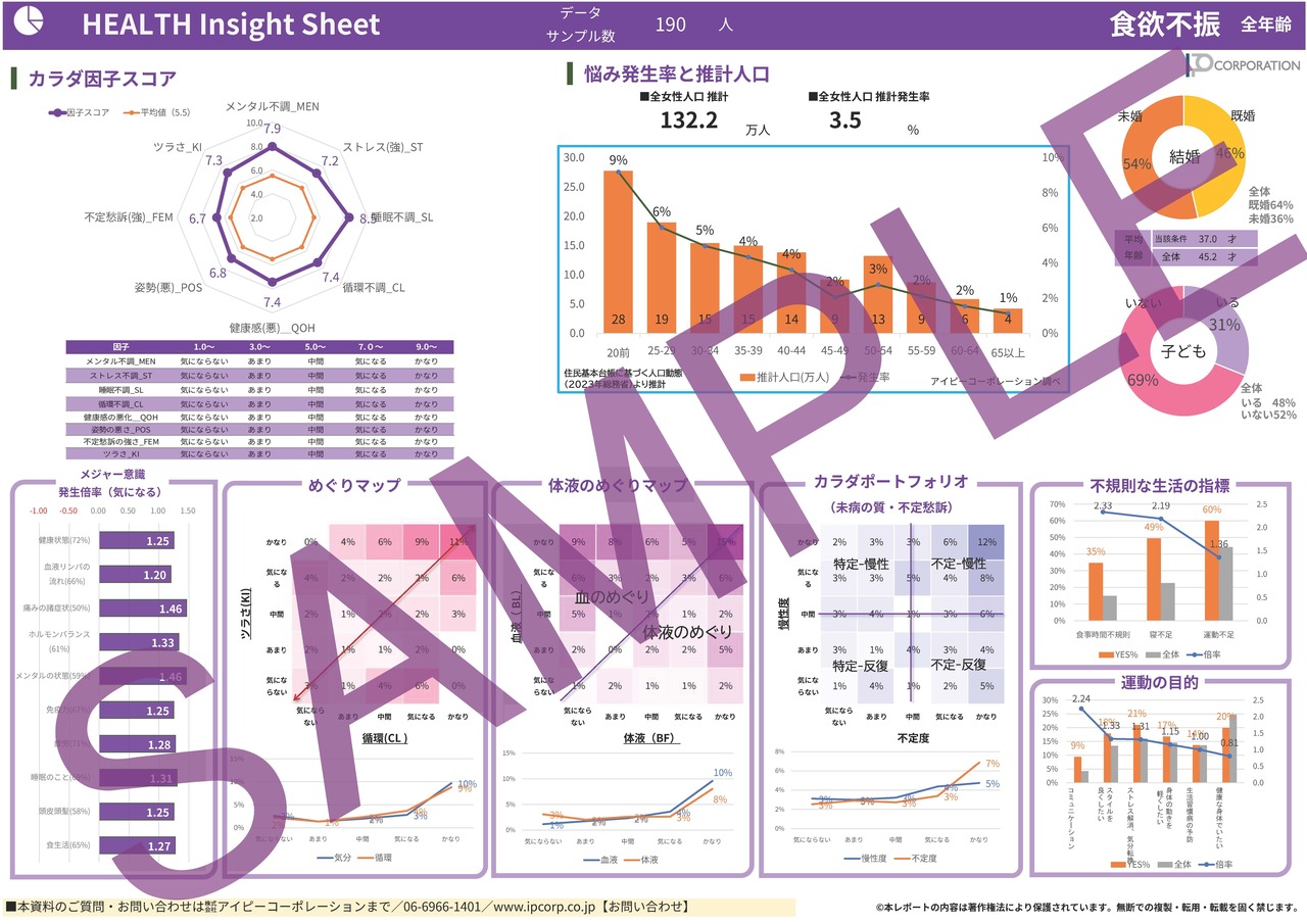 女性の64%【サンプルデータ数3,350人】で発生している「食生活のことが気になる」を68項目で徹底的に分析。2ページに凝縮しました(SAMPLE例は画像4-5)