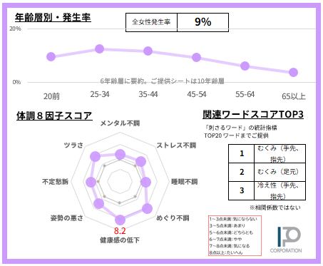 女性の9%【サンプルデータ数470人】で発生している「手先、指先のむくみ」悩みを68項目で徹底的に分析。2ページに凝縮しました(SAMPLE例は画像4-5)