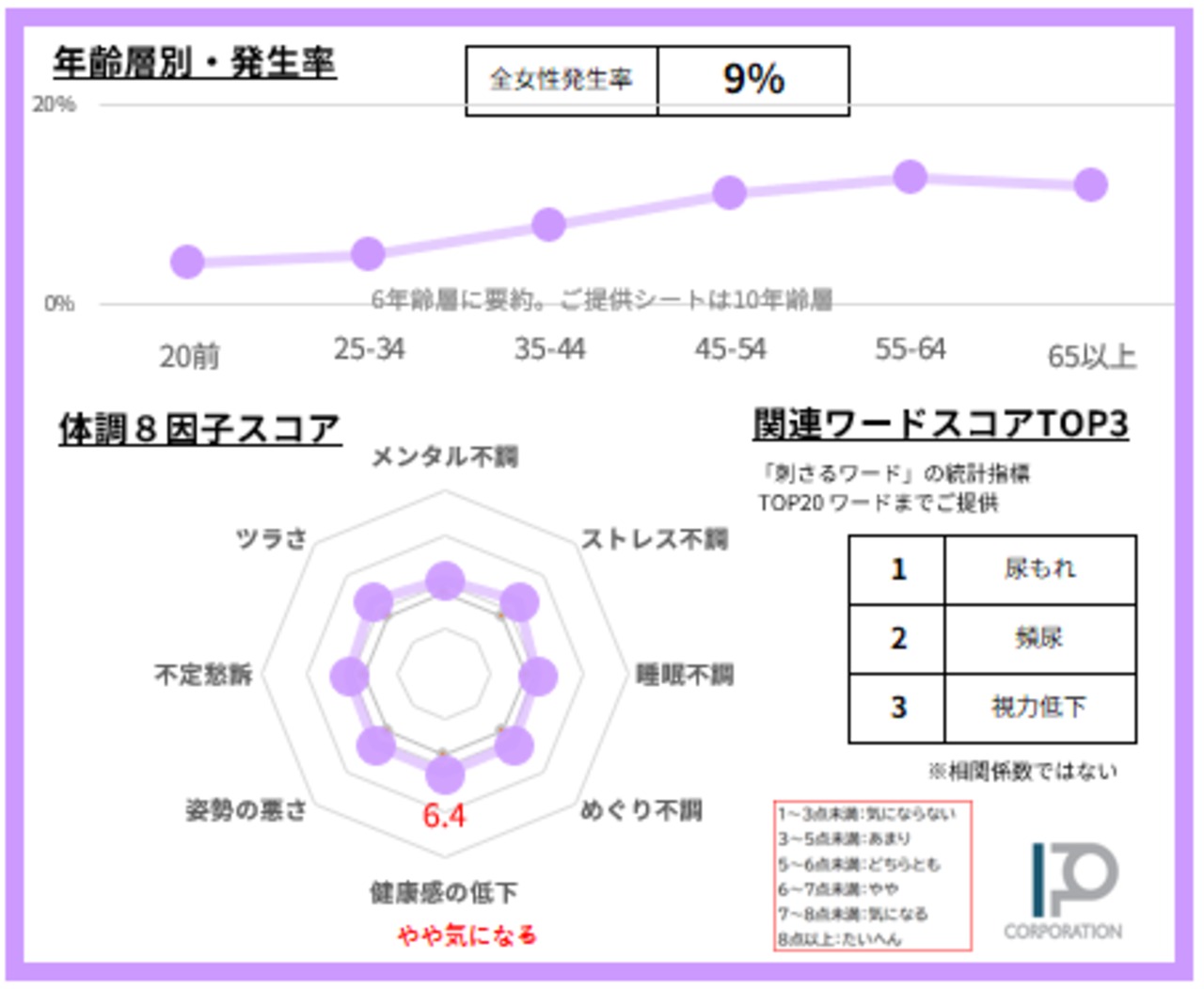 女性の9%【サンプルデータ数470人】で発生している「尿もれ」悩みを68項目で徹底的に分析。2ページに凝縮しました(SAMPLE例は画像4-5)