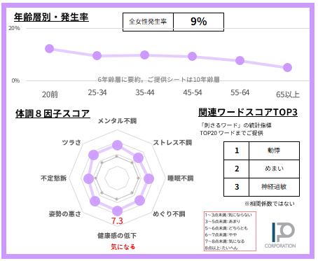 女性の9%【サンプルデータ数460人】で発生している「動悸」悩みを68項目で徹底的に分析。2ページに凝縮しました(SAMPLE例は画像4-5)