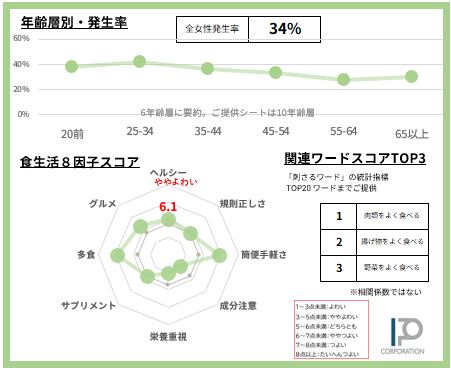 女性の34%【サンプルデータ数1,780人】で発生している「肉類をよく食べる」食スタイルを63項目で徹底的に分析。2ページに凝縮しました(SAMPLE例は画像4-5)