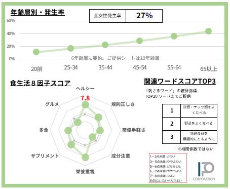 女性の27%【サンプルデータ数1,340人】で発生している「豆類・ナッツ類をよく食べる」食スタイルを63項目で徹底的に分析。2ページに凝縮しました(SAMPLE例は画像4-5)