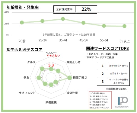 女性の22%【サンプルデータ数1,130人】で発生している「揚げ物をよく食べる」食スタイルを63項目で徹底的に分析。2ページに凝縮しました(SAMPLE例は画像4-5)