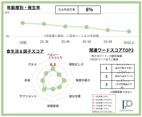 女性の8%【サンプルデータ数410人】で発生している「身体の動きを軽くするためにダイエット中」食スタイルを63項目で徹底的に分析。2ページに凝縮しました(SAMPLE例は画像4-5)