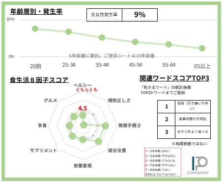 女性の9%【サンプルデータ数490人】で発生している「偏食(好き嫌い)が多い」食スタイルを63項目で徹底的に分析。2ページに凝縮しました(SAMPLE例は画像4-5)