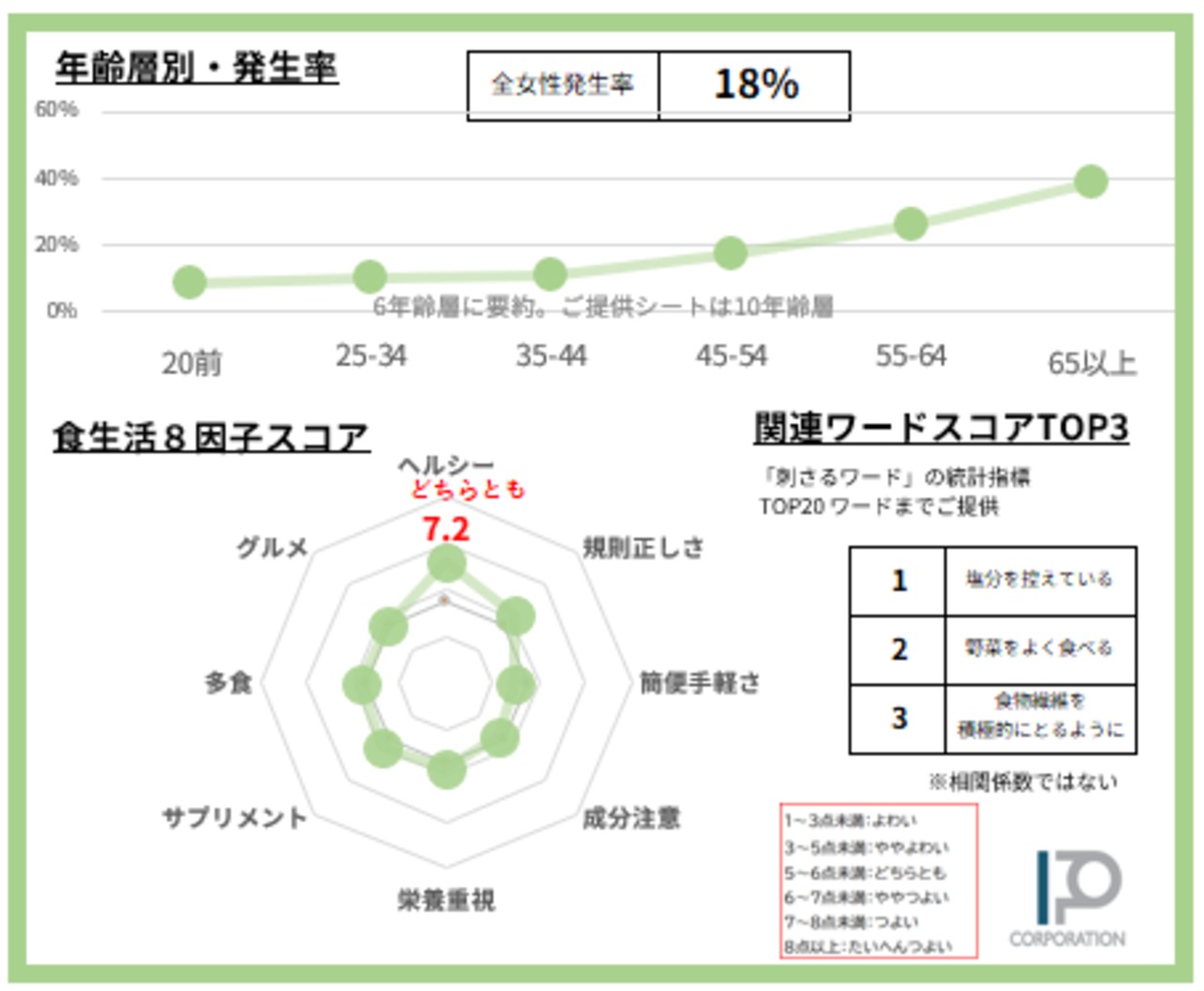・食生活8因子スコアは各10ポイント化で見える化。チャートの外側に大きいほど指向の強さを示します