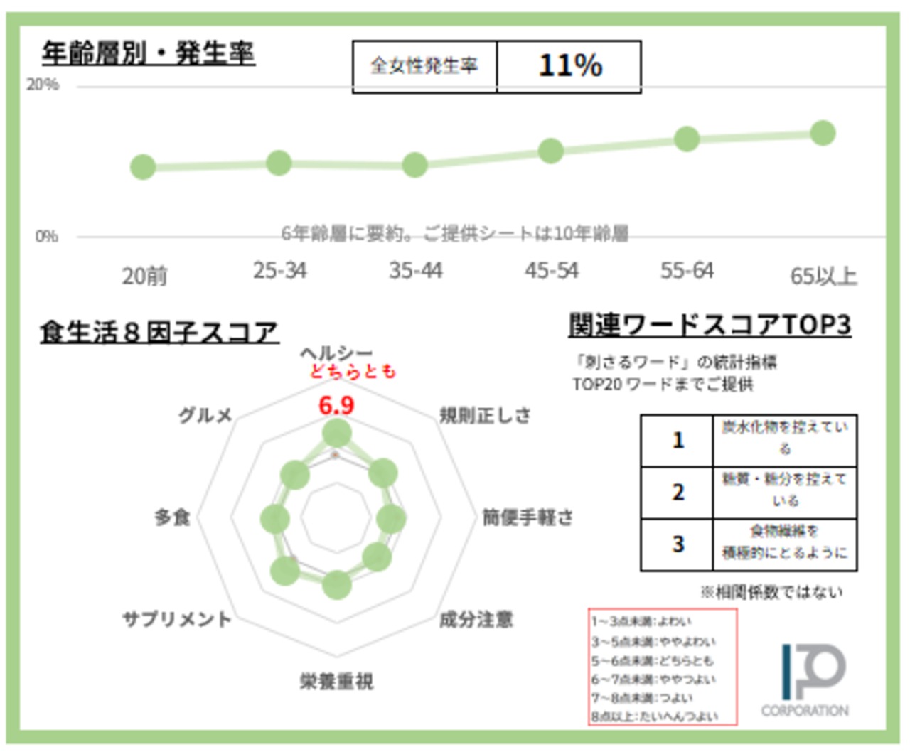 ・食生活8因子スコアは各10ポイント化で見える化。チャートの外側に大きいほど指向の強さを示します