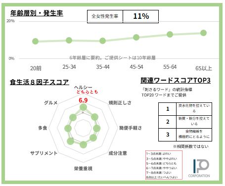 女性の11%【サンプルデータ数570人】で発生している「炭水化物を控えている」食スタイルを63項目で徹底的に分析。2ページに凝縮しました(SAMPLE例は画像4-5)