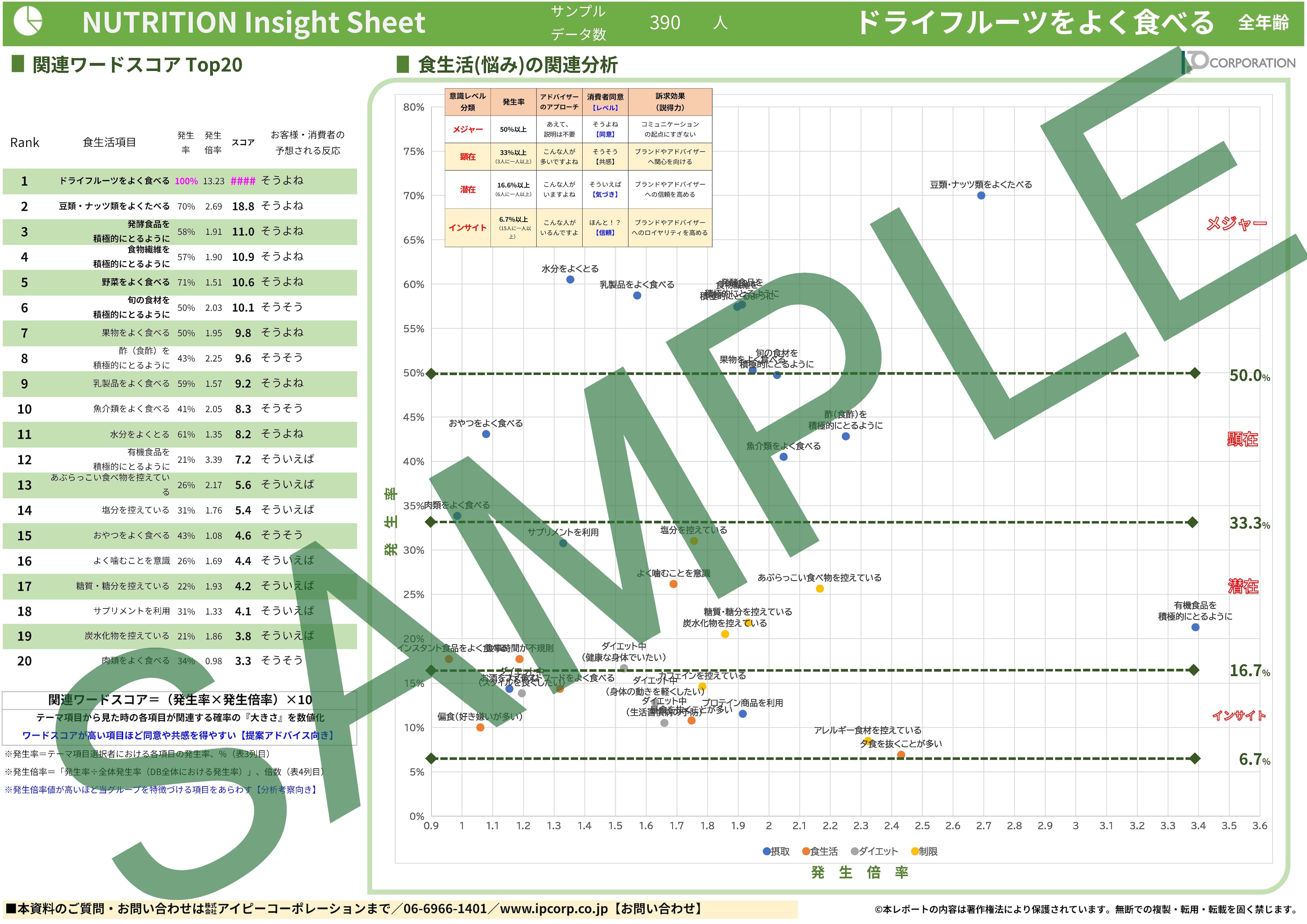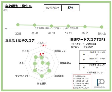 女性の3%【サンプルデータ数150人】で発生している「夕食を抜くことが多い」食スタイルを63項目で徹底的に分析。2ページに凝縮しました(SAMPLE例は画像4-5)
